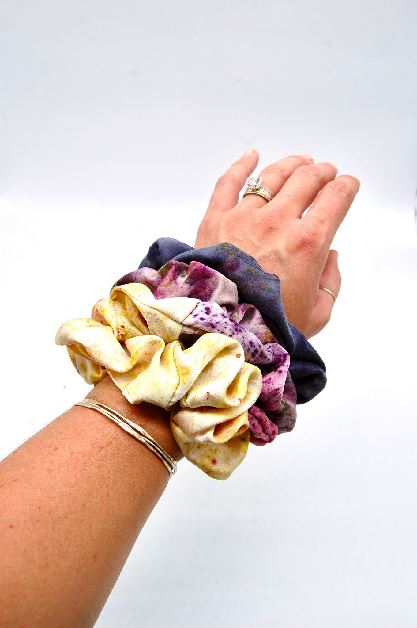 These sweet little scrunchies are sewn by me with gorgeous Charmeuse Silk and hand dyed in my small kitchen in the San Francisco Bay Area.
